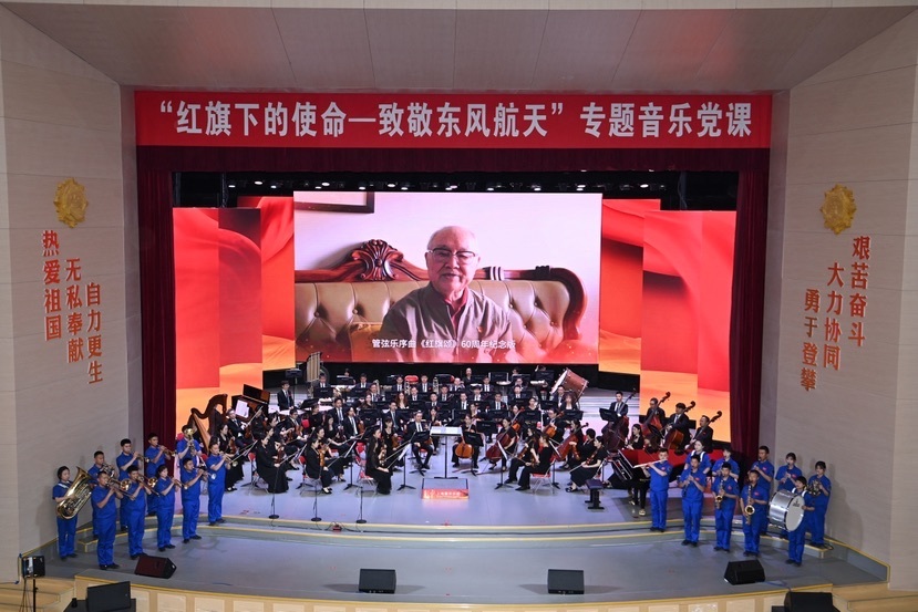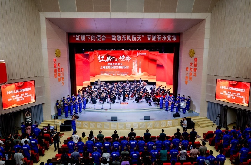 音乐会在上海爱乐乐团与酒泉卫星发射中心军乐队共同奏响的国歌声中拉开帷幕。上海爱乐乐团演奏了吕其明管弦乐序曲《红旗颂》60周年纪念版,95岁的吕其明通过视频送上祝福:“我用音乐歌颂红旗,而你们让红旗精神绽放光芒。”