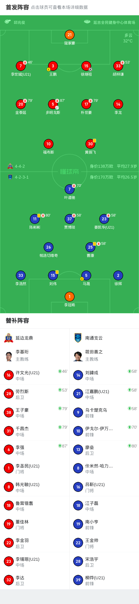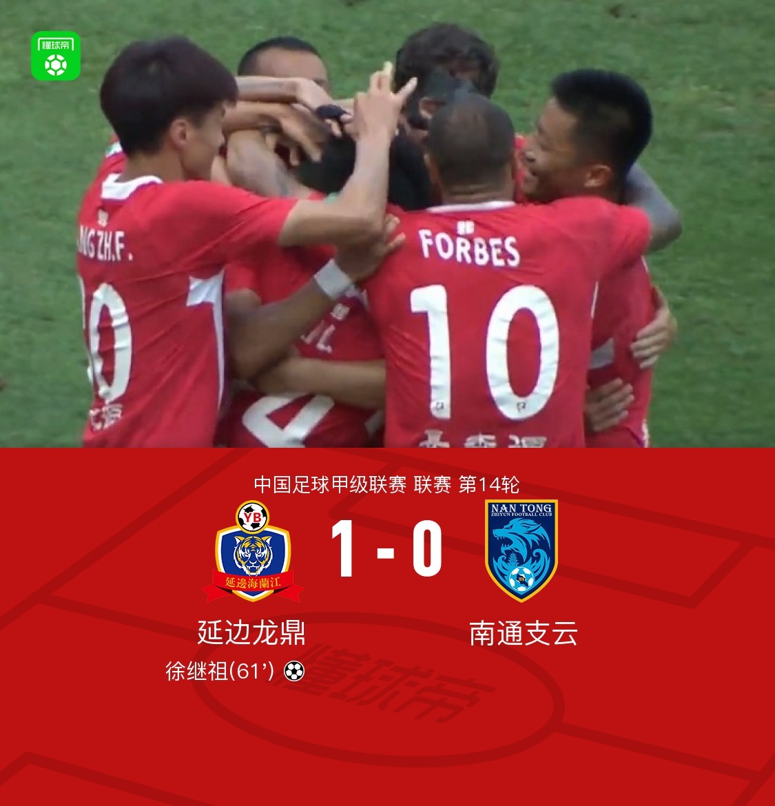 北京时间6月29日中国足球甲级联赛 联赛 第14轮,延边龙鼎主场对阵南通支云。下半场多明戈斯传中,徐继祖后点头球破门。最终比分延边龙鼎 1-0 南通支云。