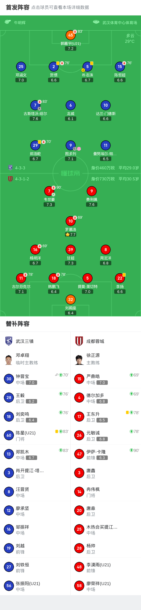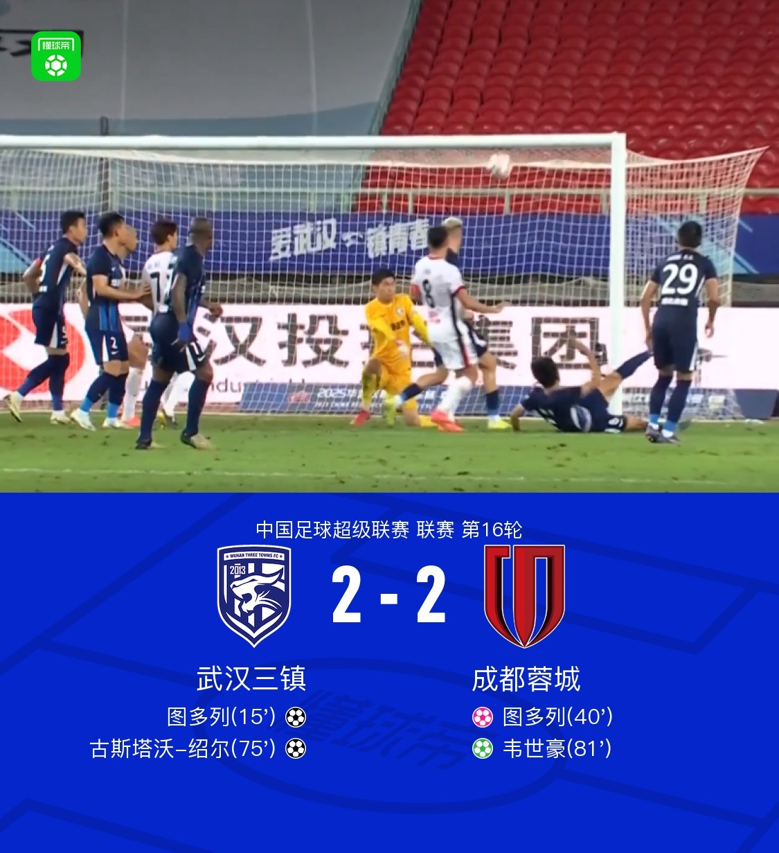 北京时间6月29日中国足球超级联赛第16轮,武汉三镇主场迎战成都蓉城。比赛第15分钟,图多列为武汉三镇首开纪录。第40分钟,图多列不慎自摆乌龙。易边再战,第75分钟,钟晋宝送出助攻,古斯塔沃-绍尔破门得分。第81分钟,韦世豪主罚点球命中,帮助成都蓉城再度追平比分。最终全场比赛结束,武汉三镇以2-2战平成都蓉城。