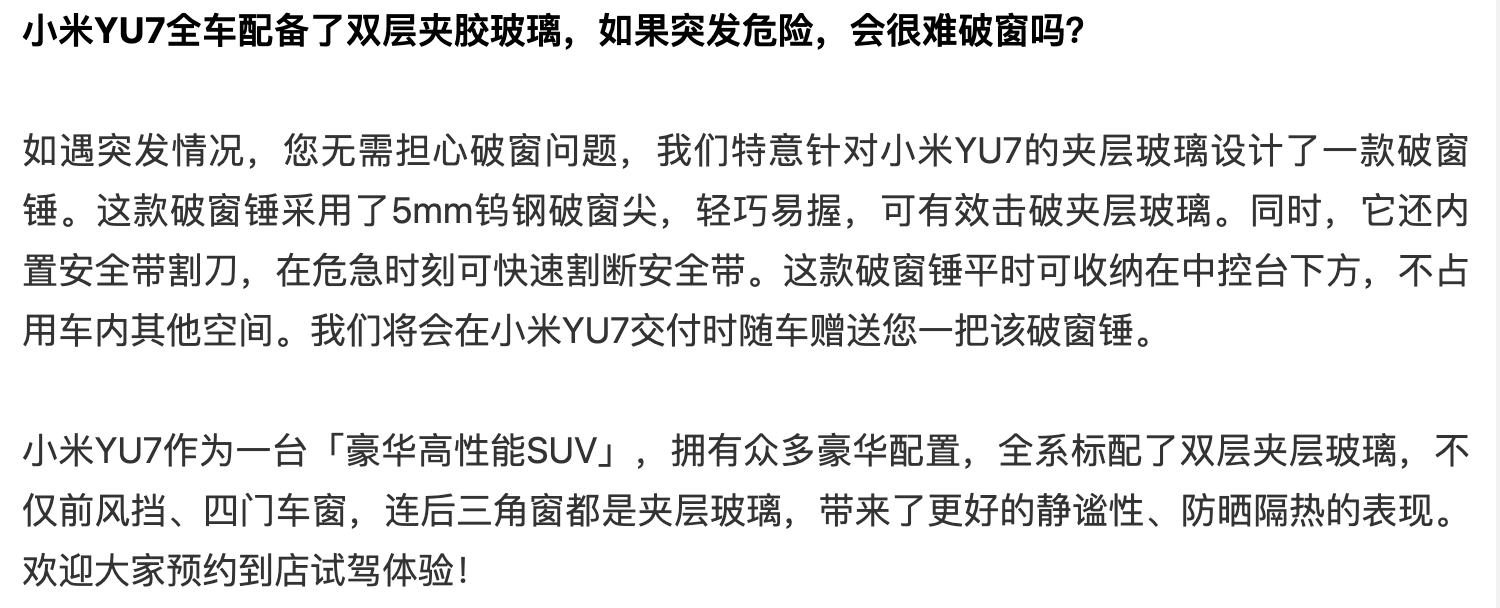 针对小米YU7全车配备了双层夹胶玻璃,如果突发危险,会很难破窗吗?小米汽车于6月29日晚在最新一期答网友问中称,如遇突发情况,您无需担心破窗问题,我们特意针对小米YU7的夹层玻璃设计了一款破窗锤。这款破窗锤采用了5mm钨钢破窗尖,轻巧易握,可有效击破夹层玻璃。同时,它还内置安全带割刀,在危急时刻可快速割断安全带。这款破窗锤平时可收纳在中控台下方,不占用车内其他空间。我们将会在小米YU7交付时随车赠送您一把该破窗锤。