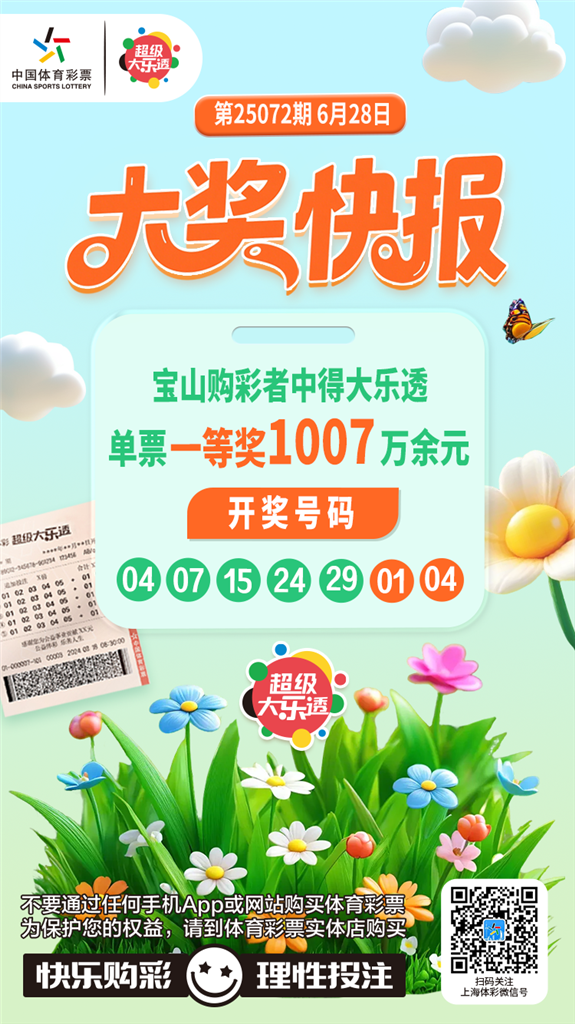 6月28日,中国体育彩票超级大乐透第25072期开奖。前区开出号码04、07、15、24、29;后区开出号码01、04。本期全国销售3.37亿元,为国家筹集彩票公益金1.21亿元。