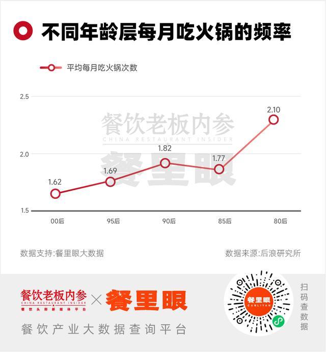 据后浪研究所数据,年轻人已经逐渐对火锅“祛魅”,大部分年轻人平均每月吃火锅次数不足2次,这个频率也是随着年龄减小而同步减少。Z世代和更年轻的消费者,正在被更多样、更轻盈、更个性化的饮食方式所吸引,火锅“社交刚需”的光环逐渐褪去。