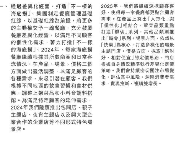 海底捞早在2024年的年报中便强调,通过差异化的运营,打造“不一样的海底捞”。2024年就陆续推出了包间店、亲子主题店、夜宵主题店,以及大型企业合作的企业店等。