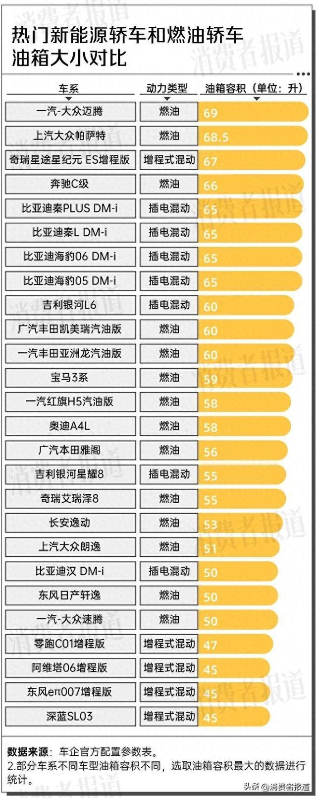 实际上,搭载超大油箱的新能源汽车不止比亚迪秦PLUS DM-i。为了实现更高的续航里程,更多新能源汽车加入超大油箱行列。《消费者报道》统计多款热门车型发现,插混和增程式混动车型搭载超大油箱的情况不在少数。