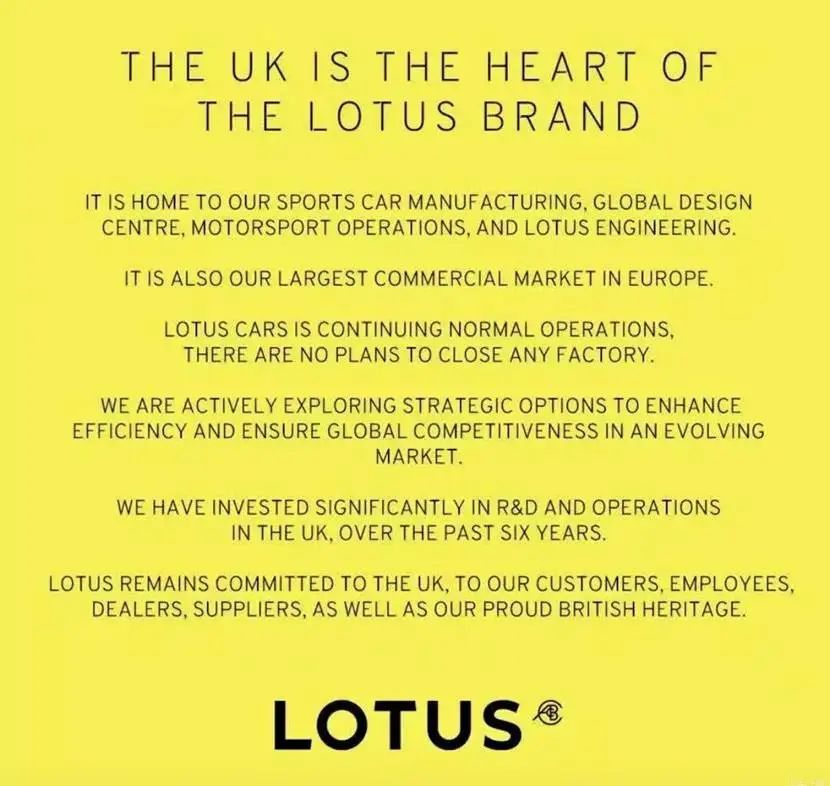 对此,莲花汽车于6月29日发表声明辟谣了以上猜测,目前公司运营一切正常,没有关闭任何工厂的计划。此外莲花汽车还表示英国是其品牌核心,过去六年里在英国的研发和运营方面也是进行了大量投资,并在进行新的产品战略布局。
