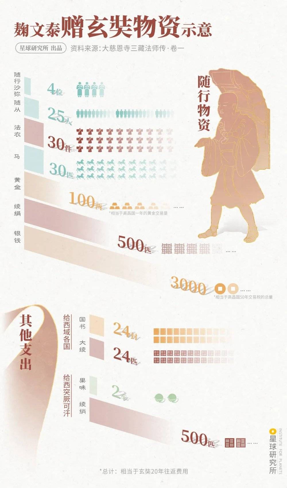 (麹文泰为玄奘准备的物资,相当于玄奘20年的往返费用,制图@淼淼/星球研究所)
