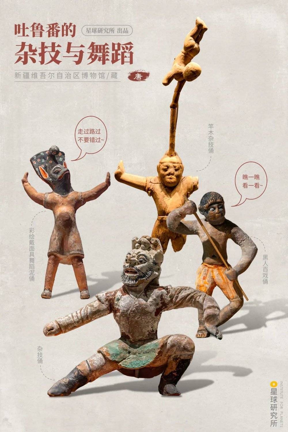 (吐鲁番杂技俑,摄影师@朱智勇&李文博&笑谈间气吐霓虹,制图@淼淼/星球研究所)