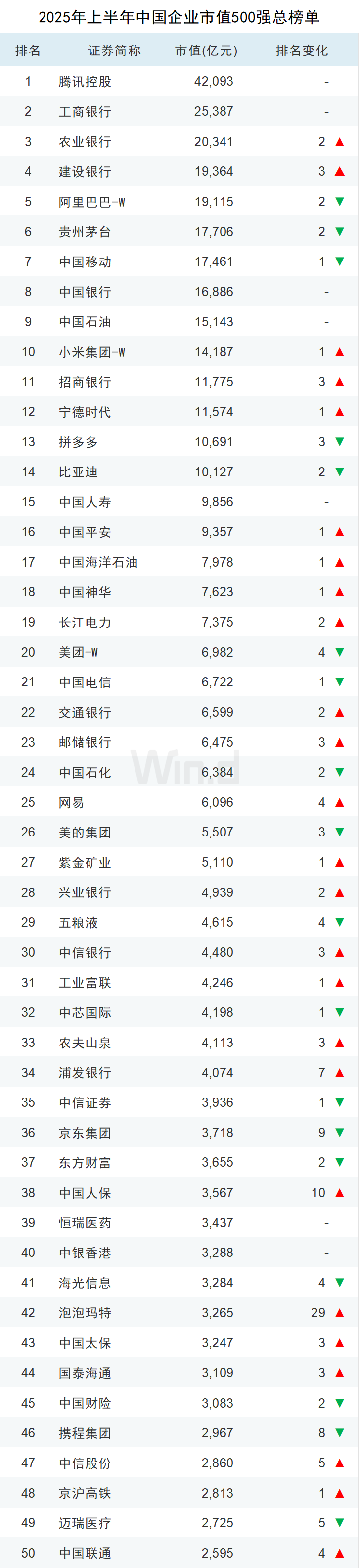 Wind最新发布2025年上半年“中国上市企业市值500强”榜单,腾讯控股、工商银行、农业银行位列市值榜前三名。市值超万亿元的企业有14家,较2025年一季度持平,其中农业银行、建设银行、招商银行排名分别提升2位、3位和3位。