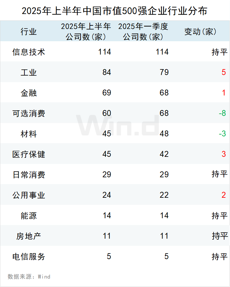 2025年上半年从市值500强企业行业公司数排名来看,其中,信息技术板块500强企业数量为114家,相比2025年一季度持平;工业板块企业数量为84家,相比2025年一季度增加5家;金融板块企业数量为69家,相比2025年一季度增加1家。