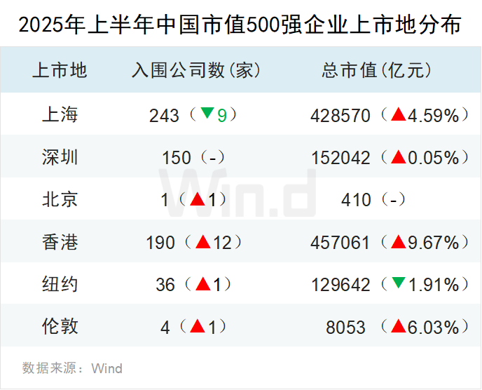 从2025年上半年入围市值500强公司上市地来看,上海243家减少9家,深圳150家持平,北京增加1家,香港190家增加12家,纽约36家增加1家,伦敦增加1家。2025年二季度以来,受金融股大幅上涨,及A股龙头赴港上市浪潮推动,上海和香港两地总市值增幅居前,其中,上海总市值增长4.59%,香港总市值增长9.67%。