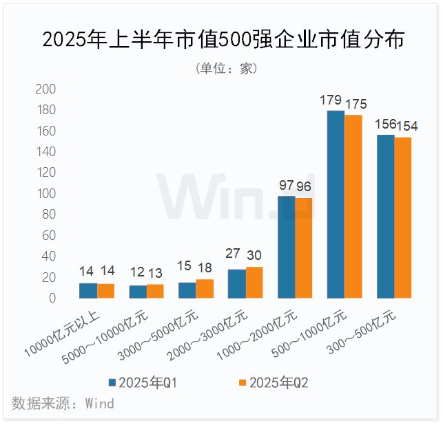2025年上半年市值500强企业各区间段波动较小。万亿市值以上企业有14家,较2025年一季度持平;5000-10000亿元市值区间段公司数量增加1家;3000-5000亿元和2000-3000亿元市值区间段公司数量均增加3家;1000-2000亿元区间段公司数量减少1家;500-1000亿元和300-500亿元区间段公司数量分别减少4家和2家。
