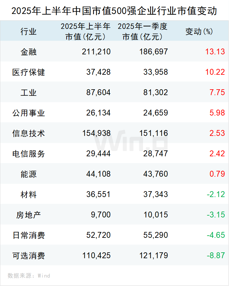 从市值500强企业行业市值变动来看,2025年上半年有7个行业市值增加,4个行业市值减少。其中,金融行业总市值相比2025年一季度增长13.13%,达211210亿元;医疗保健和工业板块市值相比2025年一季度增长10.22%和7.75;可选消费、日常消费、房地产板块市值相比2025年一季度年分别减少8.87%、4.65%和3.15%。