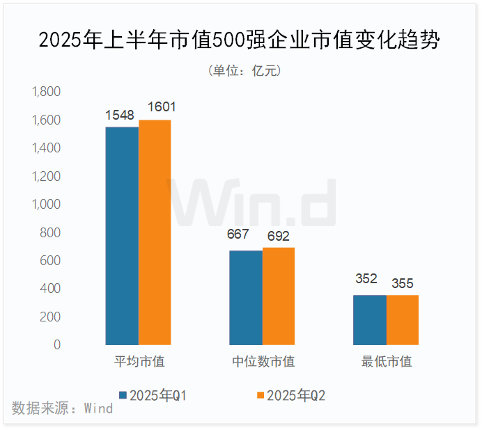 2025年上半年市值500强企业平均市值、中位数市值和最低市值分别为1601亿元、692亿元和355亿元,较2025年一季度分别增长53亿元、25亿元和3亿元。