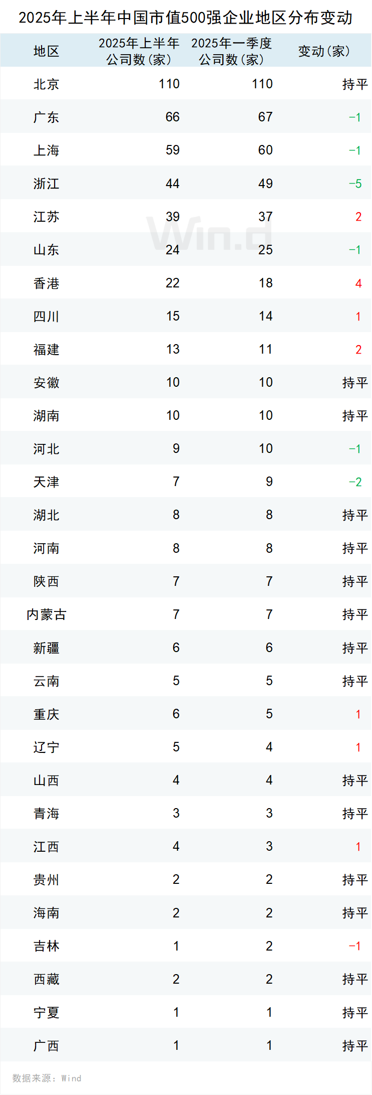 从市值500强企业注册地分布来看,2025年上半年北京、广东、上海位列前三位,分别有110家、66家和59家,其中,北京持平,广东、上海均减少1家。
