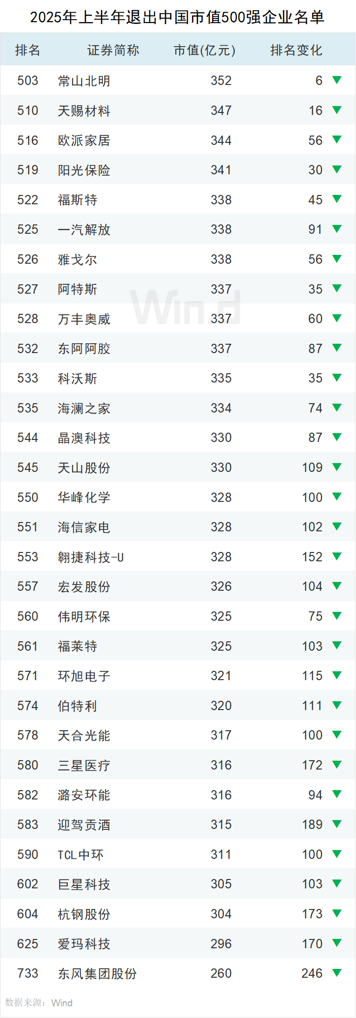 2025年上半年共有31家企业退出市值500强行列,行业风向转变和股价下跌导致部分公司市值快速缩水。