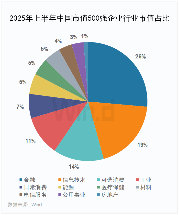 2025年上半年市值500强企业行业市值占比前三名分别为金融、信息技术和可选消费,金融业市值占比最高,达26%。