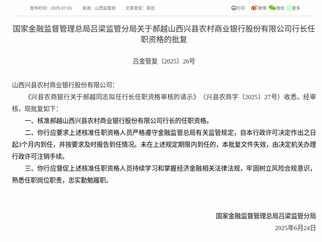 2025年6月24日,根据国家金融监督管理总局消息,《兴县农商银行关于郝越同志拟任行长任职资格审核的请示》获得通过,批复郝越山西兴县农村商业银行股份有限公司行长的任职资格。