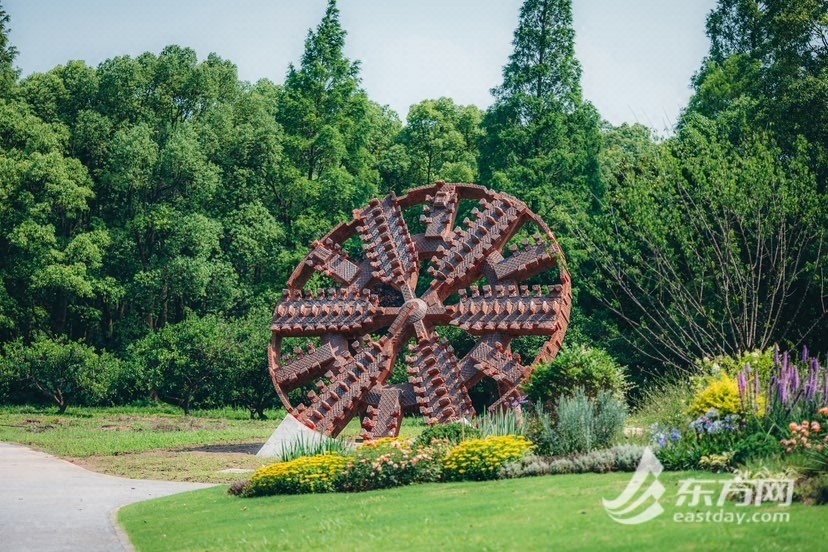 这片改造后的生态绿洲分为四大主题区域,生态与功能并重:宿根花园由原无障碍花园升级而来,上层种植樱花、海棠,春季开花繁茂;下层配置金鸡菊、八宝景天等宿根花卉,形成色彩丰富的花境,营造可触摸、可感知的自然空间;水畔林溪新开挖蜿蜒水系,沿岸种植乌桕、池杉等乔木,搭配菖蒲、千屈菜等水生植物,形成水岸相映的生态景观,提升生物多样性;水上森林利用原有水杉林基础,增设穿梭其间的木栈道,方便游客近距离观察森林生态。林下补植耐阴花卉,深秋时节水杉变色的景观将成为特色;“先行号”盾构刀盘展区陈列我国首台具有完全自主知识产权地铁盾构机“先行号”的刀盘实物,记录其在上海轨道交通建设中的突破性成就(如2005年创日推进32环纪录,2009年突破设计极限达10公里),打造兼具科普教育与历史纪念意义的科技地标。