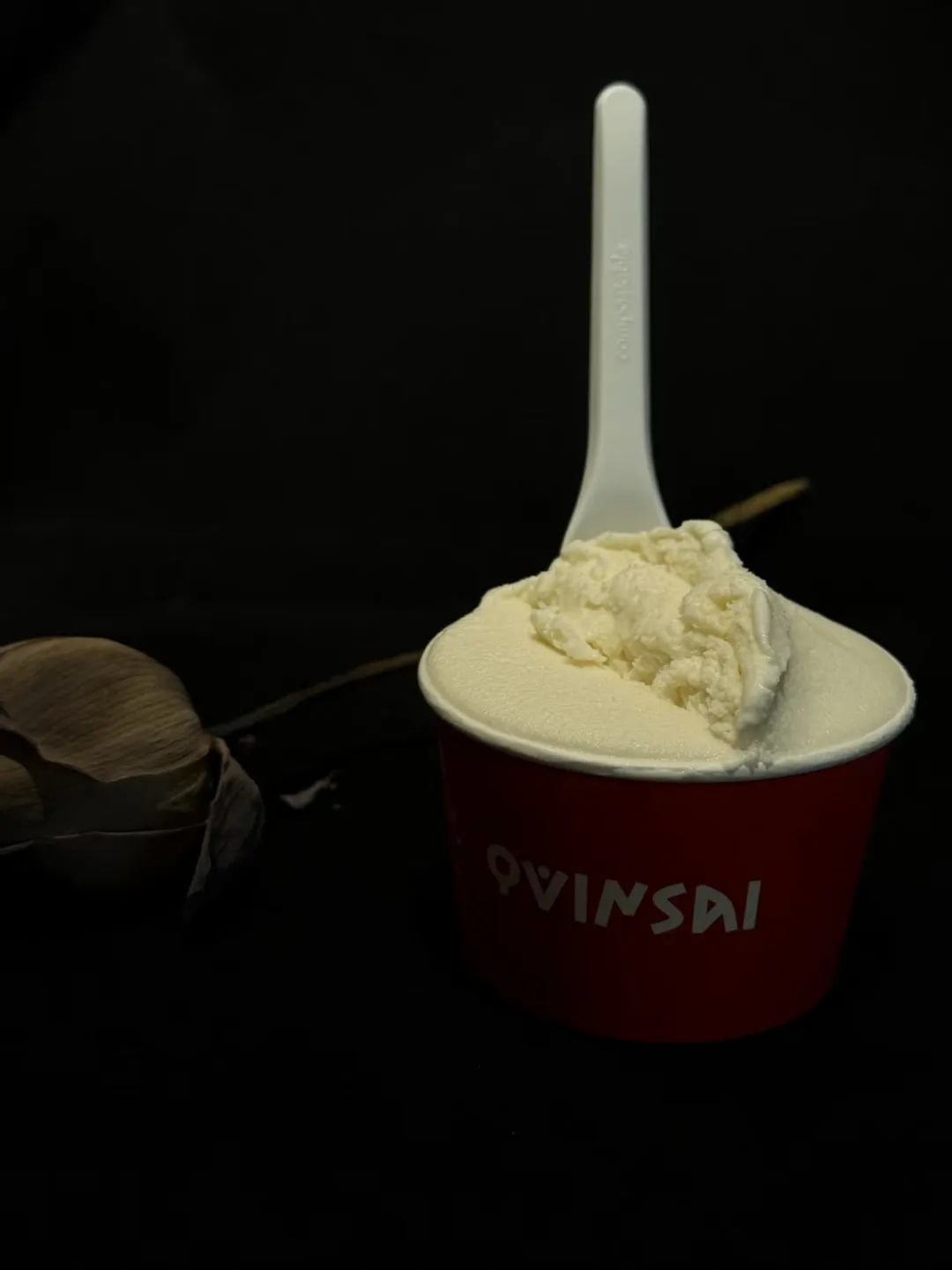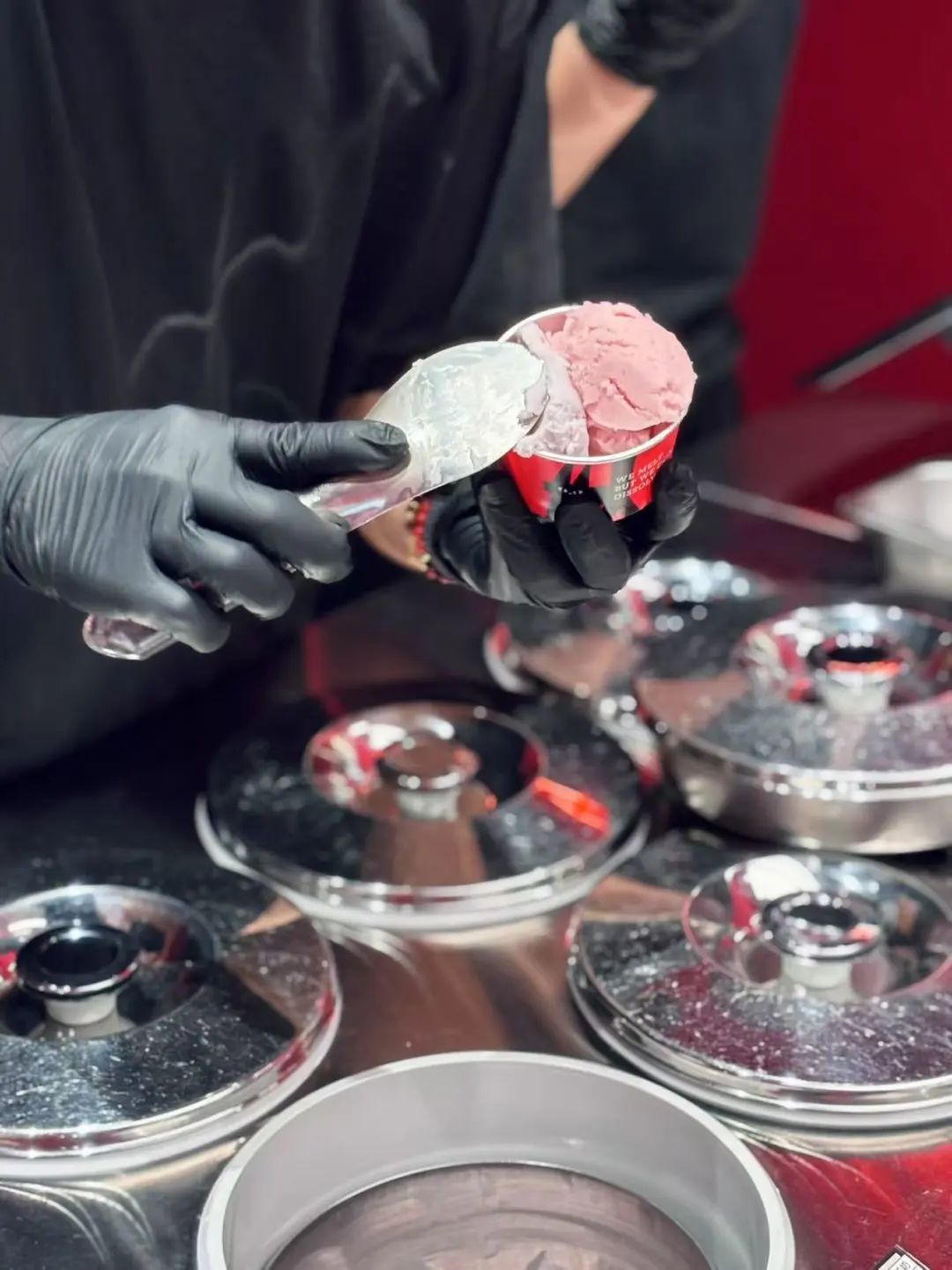 这种矛盾的魅力也体现在产品上。招牌黑松露口味,香草奶底搭配云南野生黑松露,浓郁的菌类香气之外,是咸、甜、鲜的微妙平衡和层层递进;灵感来自经典法甜“伊斯法罕——玫瑰荔枝覆盆子”的野玫荔枝,应季桂味荔枝和平阴重瓣玫瑰的花果香气融入奶底,点缀覆盆子颗粒,用冰淇淋的方式讲述中东玫瑰的绮丽。