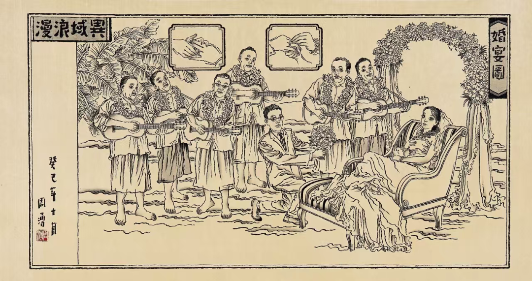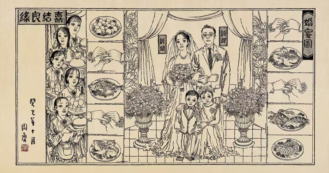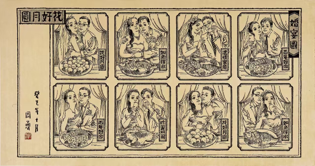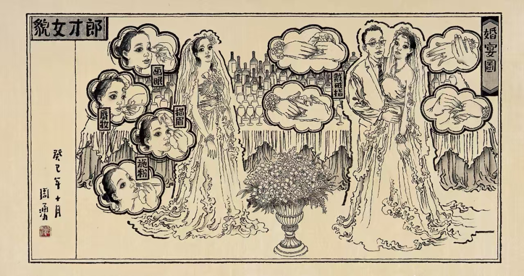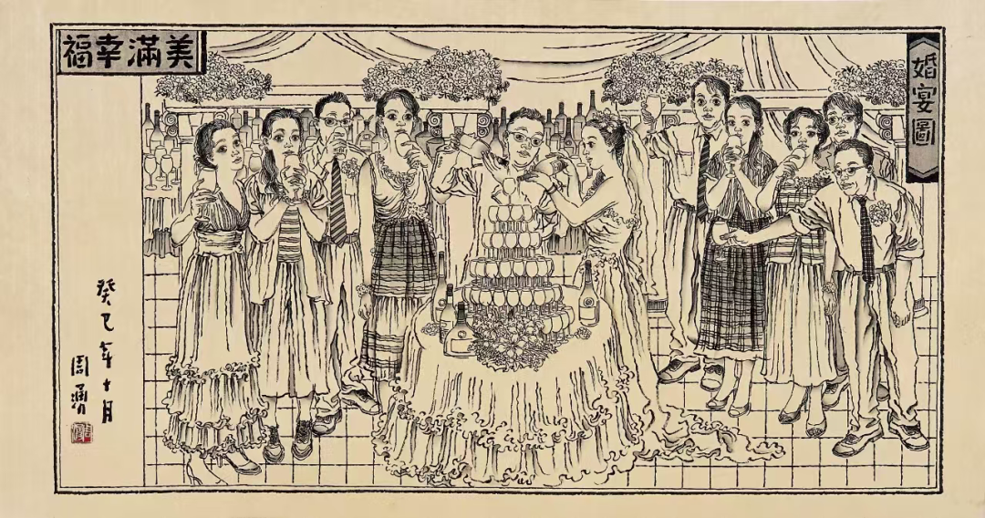 《美胸图》和《婚宴图》是周湧两个极有辨识度的视觉图谱。他用传统的民间的艺术语言,将日常生活作为对现实体验的物质性敏感,并融入自我的图像叙事间。很显然,这是中国社会快速从传统形态向现代形态转型,从农耕文明向工业文明转型,从乡土社会跑步进入城镇化所带来生存实境翻天覆地的变化。而物质的高度充裕,消费主义的盛行,特别是奢华奢靡风气的流行。女性的容貌焦虑、身材焦虑,婚姻的场面、豪华度攀比,使社会普遍弥漫着一种超消费景观。周湧敏锐地感知到这种社会风气的流行,特别是在消费社会程度发达的前沿城市广州,敏锐的直觉体验促使他用最传统的方式,讲述着能够引起共情和共鸣的社会现实问题。社会上流行的日常性“美容”和“婚宴”,就成为周湧观察社会的角度和方法。而对生存现实的日常性记录和表达也为阅读者观察周湧的视觉讲述提供了艺术方法论。这是中国发展到这个阶段所出现的阶段性问题:社会的深层病态,医患问题,医疗问题,铺张浪费讲排场。而对日常性的图像表达,很显然成为社会发展进程中一种精神的记录。弥漫其间的既有周湧艺术的发展与变化,更有周湧借助传统媒材,日常生活图景,将日常生活现实,透过其酣畅淋漓的水墨表达,散发出的却有着一种艺术的光晕,美容、婚宴看似日常,亦非日常,彼此交织缠绕,散发出的是周湧一种来自内心深处对当代社会现实刻骨铭心的体验。传统的卷轴图卷,传统的阅读观看体验,但现实生活实境却步步紧逼,繁华喧嚣热闹的背后,隐匿着的是周湧的忧虑及在喧嚣中的孤独,隐匿其间的是繁华背后的溃烂和日常性中的深刻。这也为他以后以个人视角,讨论个人存在的问题及《丑角》系列的诞生奠定了视觉叙事基础。
