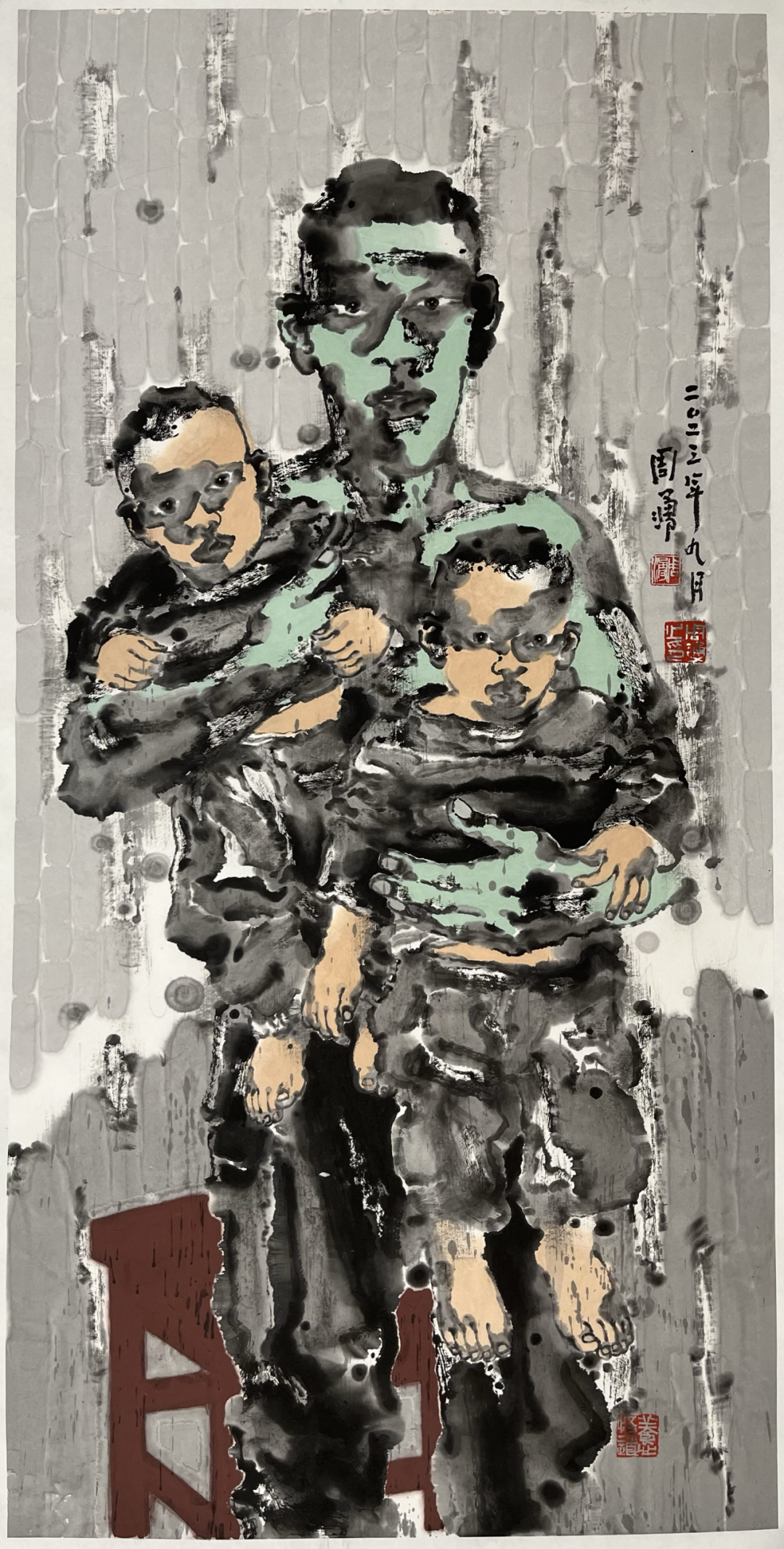 ▲周湧 《抱孩子的人》 之一 纸本水墨 138x69cm 2021