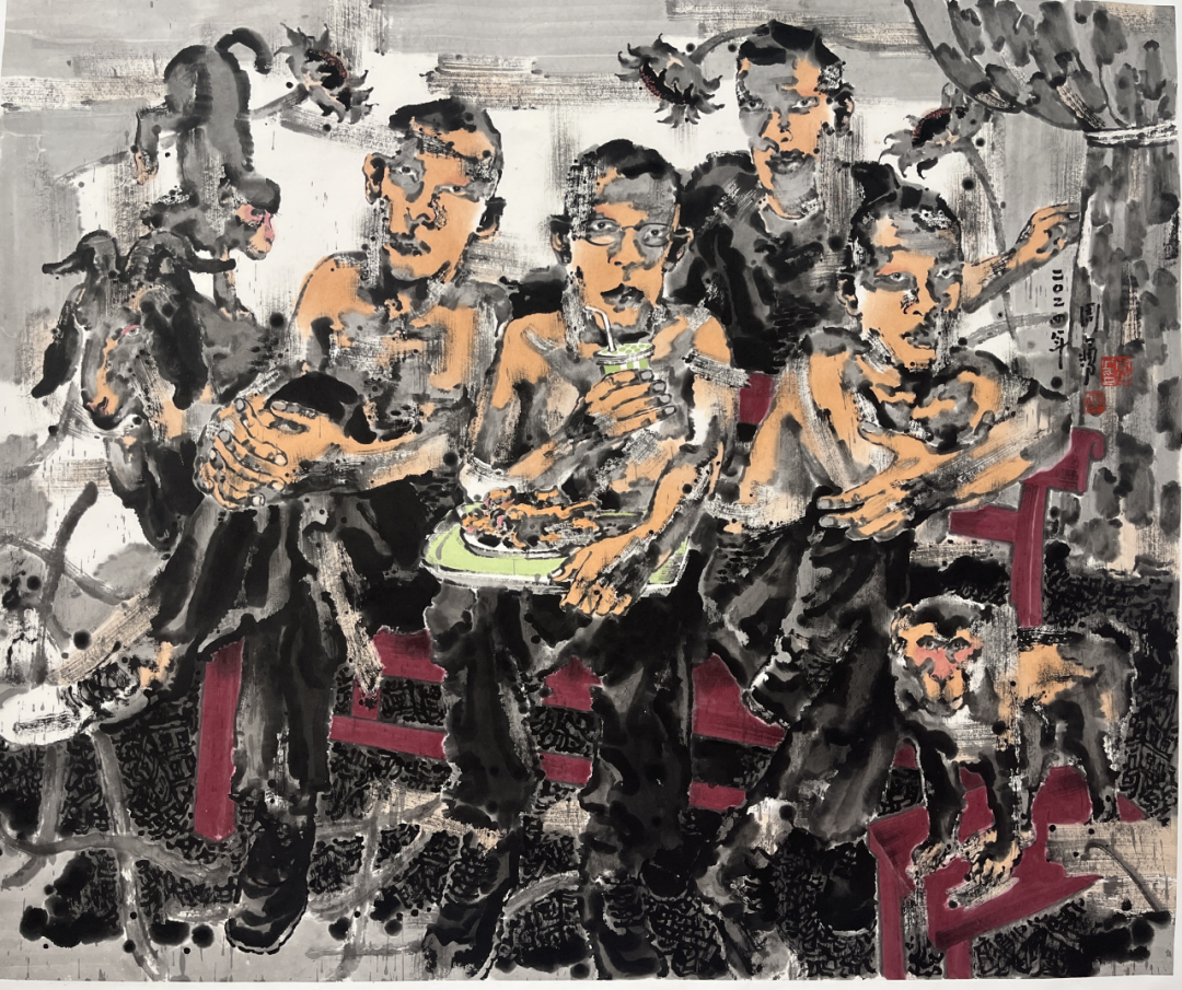近日为撰写本文,我仔细查阅了周湧的相关作品,我的深刻印象是:比起《新生活》系列来,其直接表现身边生活的创作路线虽然没有变化,但创作主题显然有了更新的拓展,而且,画中场景的视角处理得更为新颖,故很容易让人们由此警惕生活中熟视无睹的现象。正是考虑到周湧的这一创作方式与围棋高手过招后的“复盘”方式有异曲同工之妙,故我们特将本展命名为“复盘——周湧作品展”。只不过他不是如实的“复盘”,而常常会采用夸张、调侃或反讽的手法去对各种异化了的“新生活”进行变异性“重现”。比如《丑角系列》就借用中国传统戏曲脸谱中的丑角形象隐寓了现实中那些自以为是的文人;《假文人系列》以夸张化、幽默化的人物组合揭示了当下一些所谓知识分子的无奈和虚假。而2020年-2024年的众多作品则用超现实的场面强调了对于生命的悲悯与关怀等等。与此相关,作品的艺术表现同样有了巨大飞跃。倘若进行深入研究,我们不难体会到,基于对以往创作的深刻反思,他已经完全放弃了以西方当代绘画——如波普绘画——简单改造传统水墨画的激进化思路,转而采用了更有当下意义的创作方法。具体言之,他是一方面合理转换了传统水墨的一些表现手法,另一方面则理性借鉴了西方当代绘画中的若干元素。当然,在此过程中,这二者又是相互生发、相互交融的,而这不但使周湧在两者之间找到了新的创作路径,也很好维护了水墨作为文化基因的主体性、当代文化身份认同以及全球化与本土化的平衡问题。
