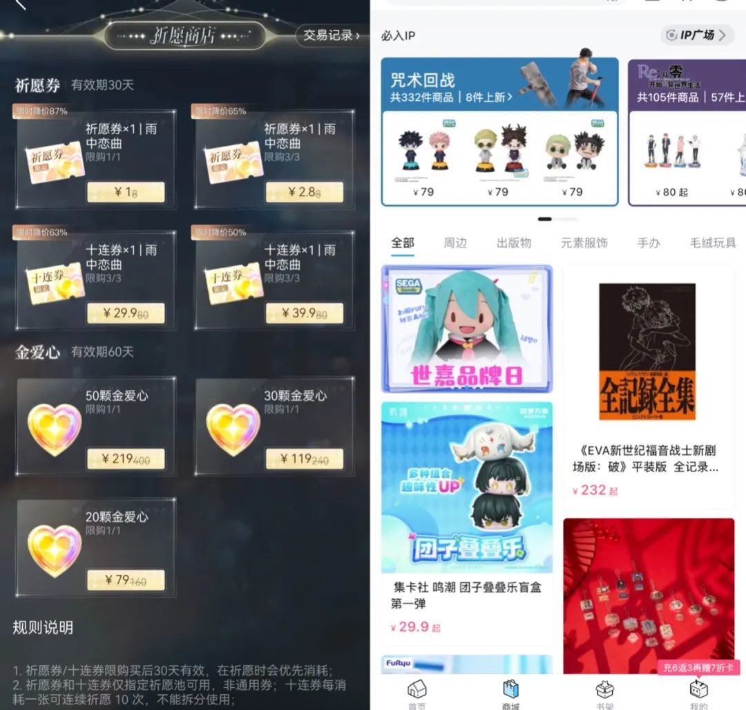 在哔哩哔哩漫画App首页,商城则占据了显要的位置。毕竟B站手握众多高人气日本动漫IP的版权,它们的周边吸引力要比国漫高上不少。从2019年到2014年,B站授权IP总数已累计近200个,合作品牌数量超500个,授权次数超过1600次。仅2024年一年,B站国创IP联动商品SKU破万,IP相关商品销售额突破10亿元大关。