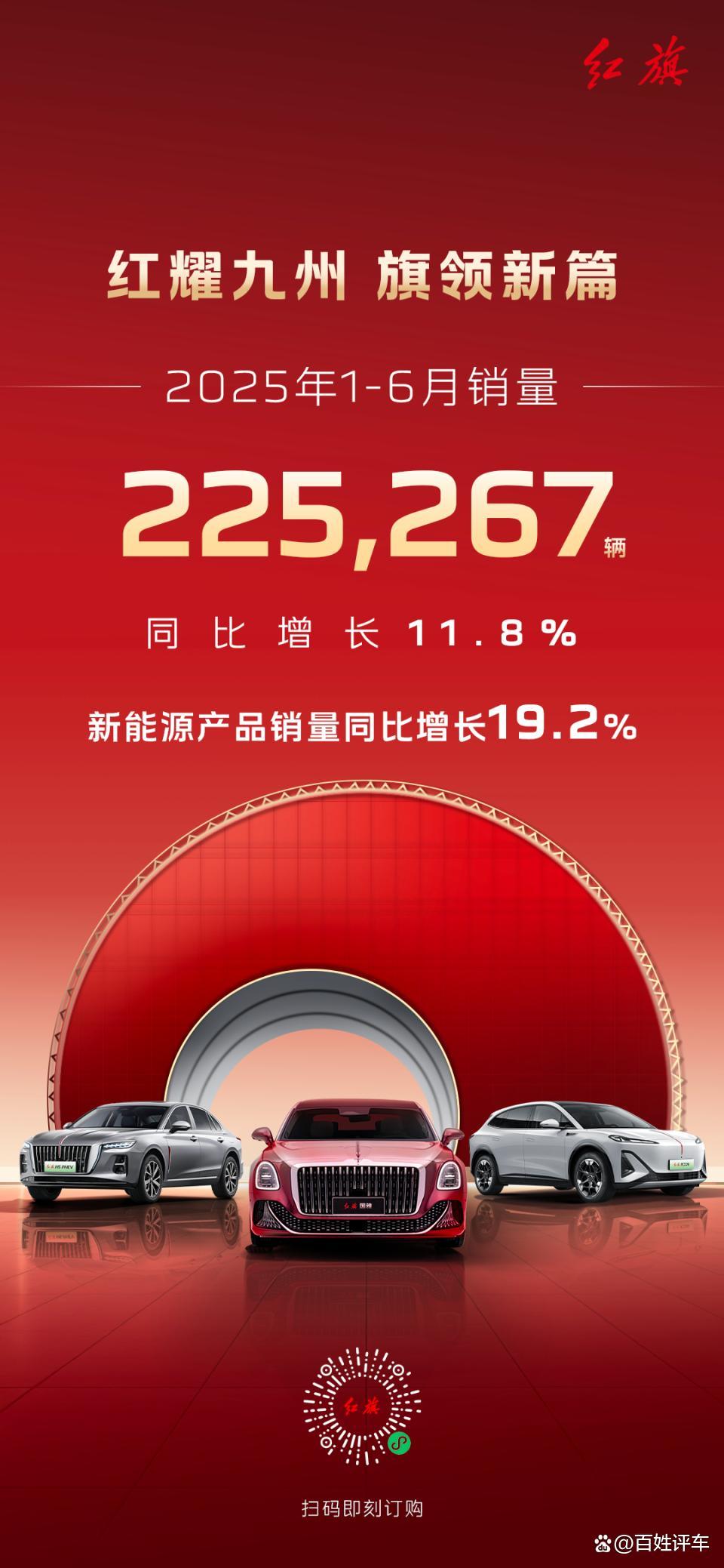红耀九州,旗领新篇。2025年7月1日,一汽红旗发布最新销量成绩:6月份,红旗品牌单月销量突破5.2万辆,同比增长29.6%,1-6月累计销量突破22.5万辆,同比增长11.8%,稳步领跑自主豪华品牌阵营。其中,红旗天工家族系列产品6月销量环比增长60.9%,红旗PHEV混动家族系列产品6月销量环比增长16.1%,智电产品扩容成效显著。红旗金葵花产品6月销量环比增长9.0%,持续在超豪华市场打造具有东方神韵的顶级豪华体验。
