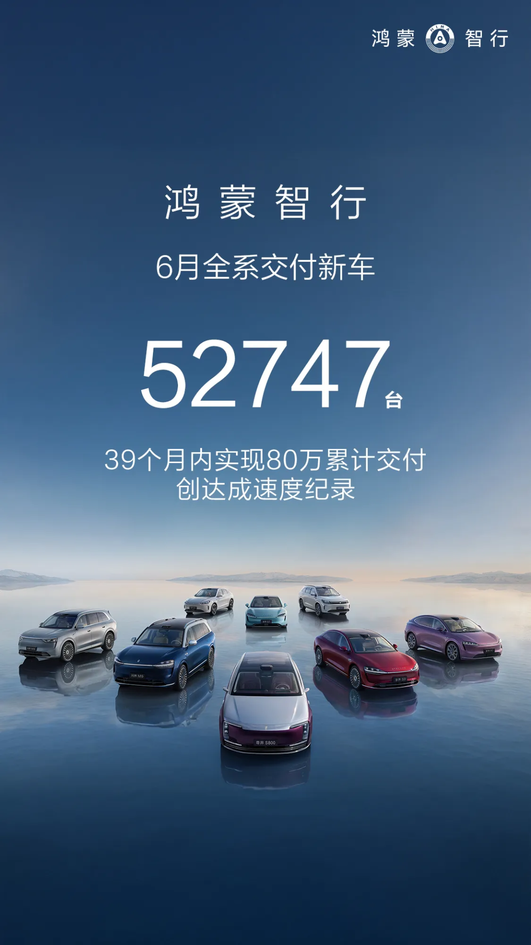 6月鸿蒙智行迎来交付量爆发期,单月全系交付52747辆,单日交付量3651辆,分别刷新鸿蒙智行单月、单日销量历史新高。其中,问界系列6月交付44685辆。