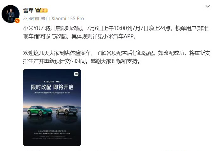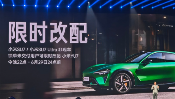 7月1日,小米汽车创始人雷军发文宣布,小米YU7将在7月6日10:00至7月7日24:00期间,开启限时改配。已锁定订单的非准现车用户可以在这一时间段进行限时改配。雷军表示,欢迎这几天大家到店体验实车,了解各项配置后仔细选配。并指出如改配成功,将重新安排生产并重新预计交付时间。