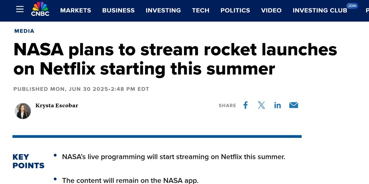NASA认为,此次合作有助于其科学探索成果覆盖更广泛人群,包括Netflix全球超过7亿用户,进而在现代媒体环境中提升全球公众对太空探索的参与度。
