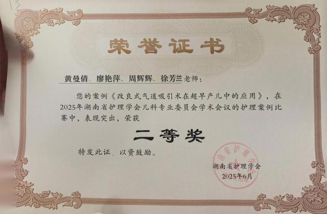 在2025年湖南省护理学会儿科专业委员会学术会议护理案例竞赛中,南华大学附属南华医院新生儿科报送的《改良式气道吸引术在超早产儿中的应用》案例,从89个参赛作品中脱颖而出,荣获“二等奖”!这一佳绩不仅彰显了科室在新生儿护理领域的创新实力,更标志着医院新生儿儿科护理水平再上新台阶。