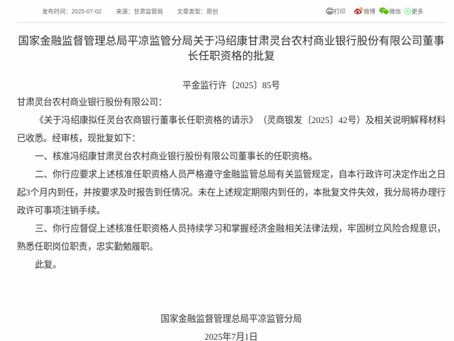 2025年7月1日,根据国家金融监督管理总局消息,《关于冯绍康拟任灵台农商银行董事长任职资格的请示》获得通过,批复冯绍康甘肃灵台农村商业银行股份有限公司董事长的任职资格。