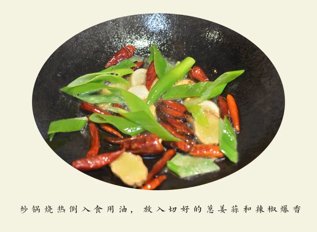 2,炒锅烧热倒入食用油,放入切好的葱姜蒜和辣椒爆香
