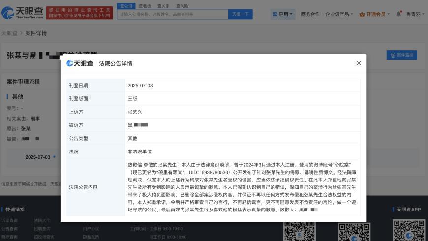 天眼查司法案件显示,近日,法院公开黑某某某向张艺兴的致歉声明。公告显示,黑某某某于2024年3月期间发布了针对张艺兴先生的侮辱、诽谤性质博文。目前,法院已对此作出判决,认定上述行为侵犯了张艺兴的名誉权,应当依法承担侵权责任。黑某某某表示其已经深刻认识到自己行为的严重错误,已删除全部案涉侵权内容,并保证不再以任何方式发布侵犯张艺兴先生合法权益的内容。