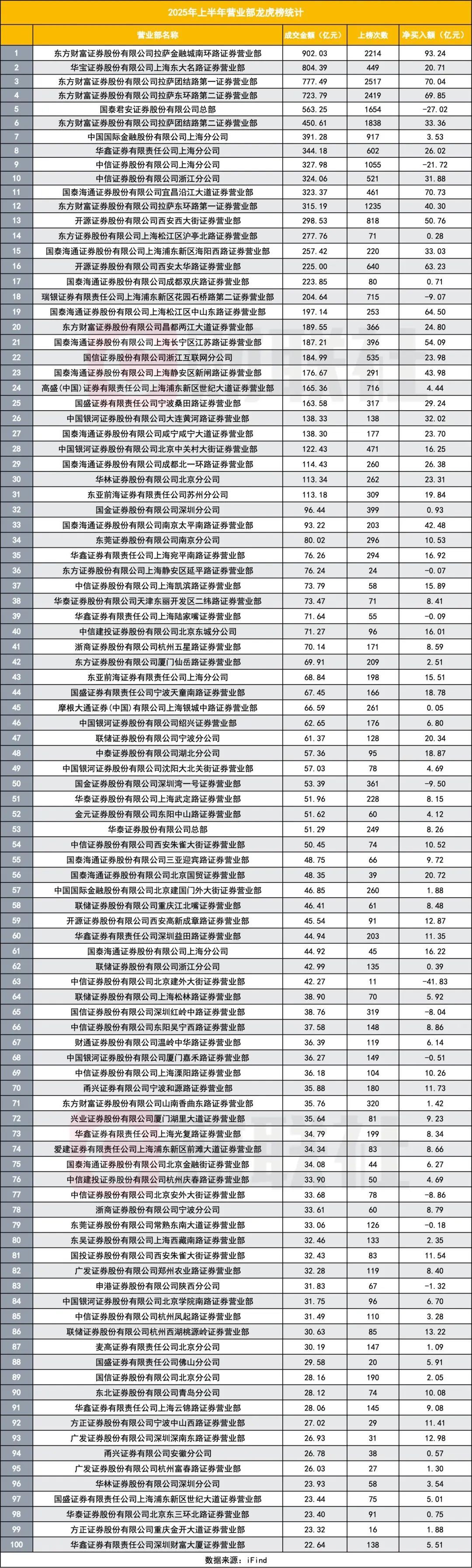在2025年上半年营业部龙虎榜的整体排名中,东方财富证券旗下营业部堪称最大赢家。其拉萨金融城南环路营业部以902.03亿元的成交金额高居榜首,上榜次数达到2214次,净买入额更是高达93.24亿元,三项指标均位居前列。