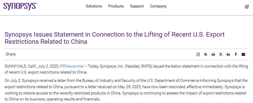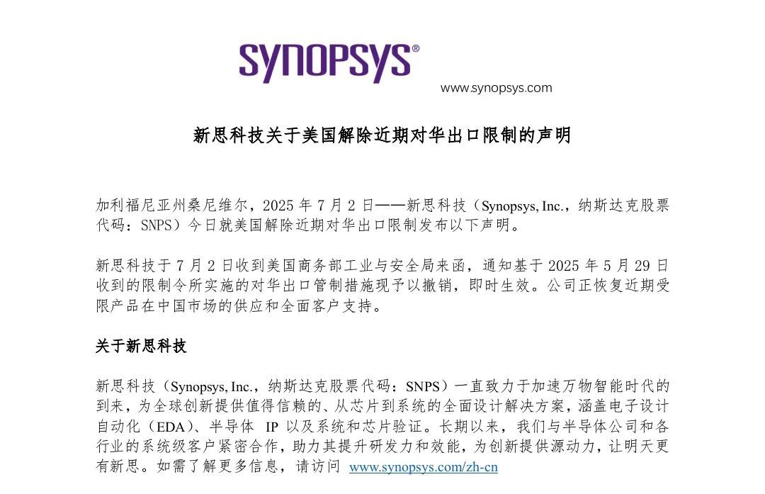 Synopsys也于当地时间7月2日发布公告称,已经收到美国商务部BIS的一封信,通知Synopsys,根据2025年5月29日收到的一封信函,与中国有关的出口限制现已撤销,立即生效。