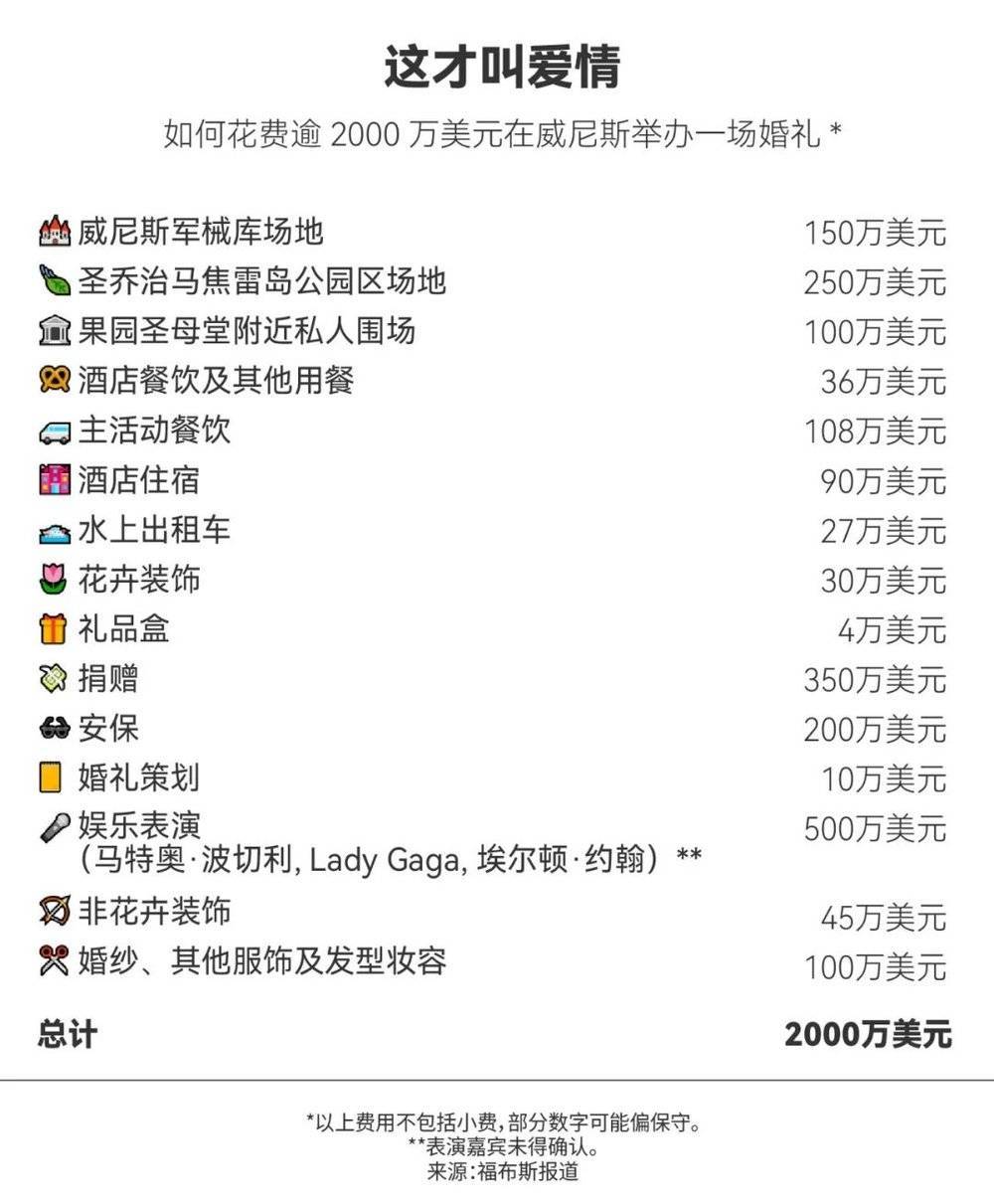 《福布斯》依据可核实开支估算,本次婚礼花费预计超2000万美元,超出美国普通婚礼均价的600余倍(据婚庆网站The Knot数据,全美婚礼平均耗资3.3万美元,约合每位宾客284美元),但对身家达2370亿美元的贝索斯而言,这笔支出显得微不足道。