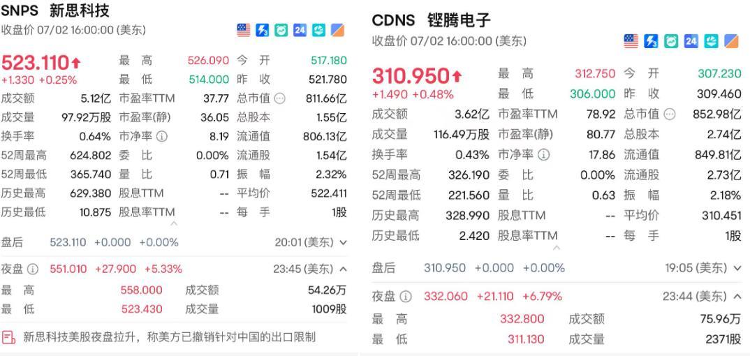 从最新的情况来看,受恢复对中国大陆客户发货消息的影响,新思科技和楷登电子在当地时间7月2日的夜盘交易中分别涨超5%、6%。