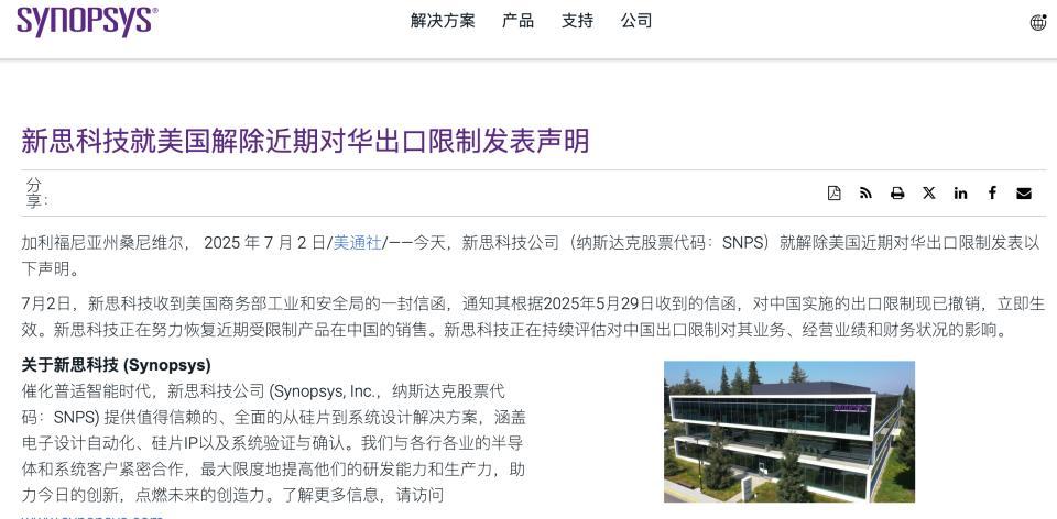 新思科技官网公布的关于收到解除出口限制通知的声明
