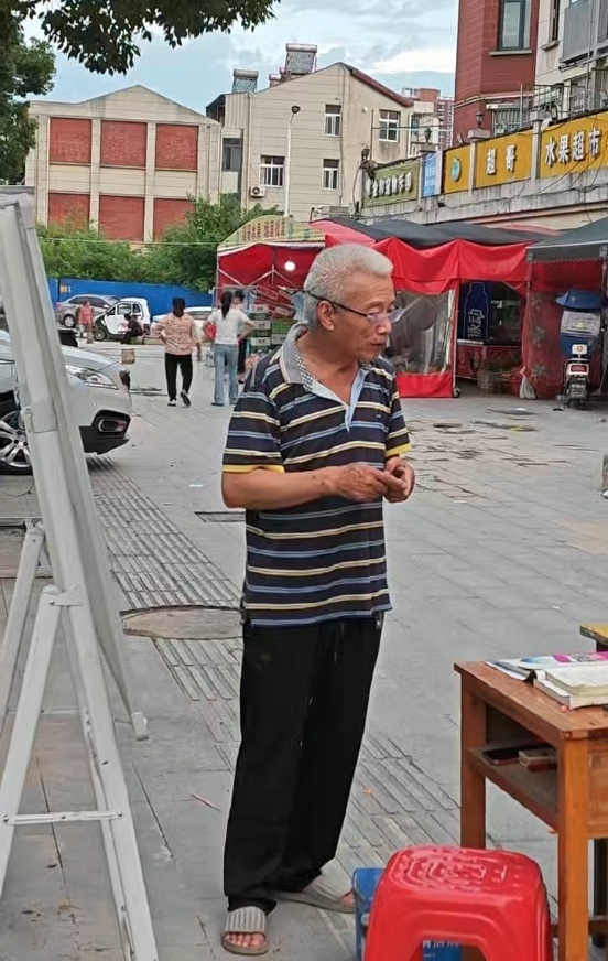 老人在街边搭建公益课堂。图/目击者提供