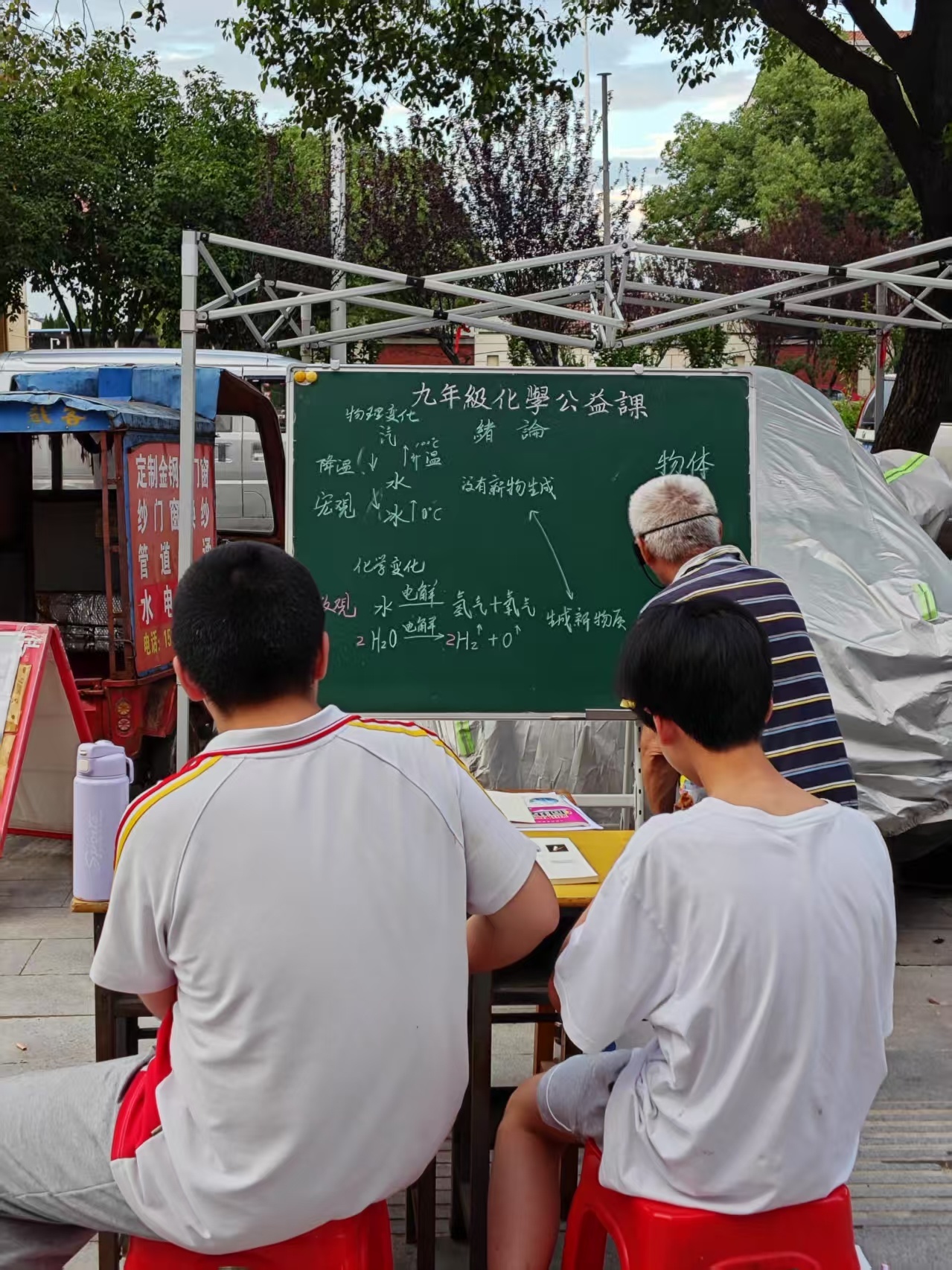 根据网友分享的图片可见,授课人是一位头发花白的老人,用一块黑板、一张桌子搭建起了简易讲台。他站在黑板前写着板书,上方工整地书写着“九年级化学公益课”和专业的化学公式。两位学员全神贯注地聆听讲解,不时低头记录要点。