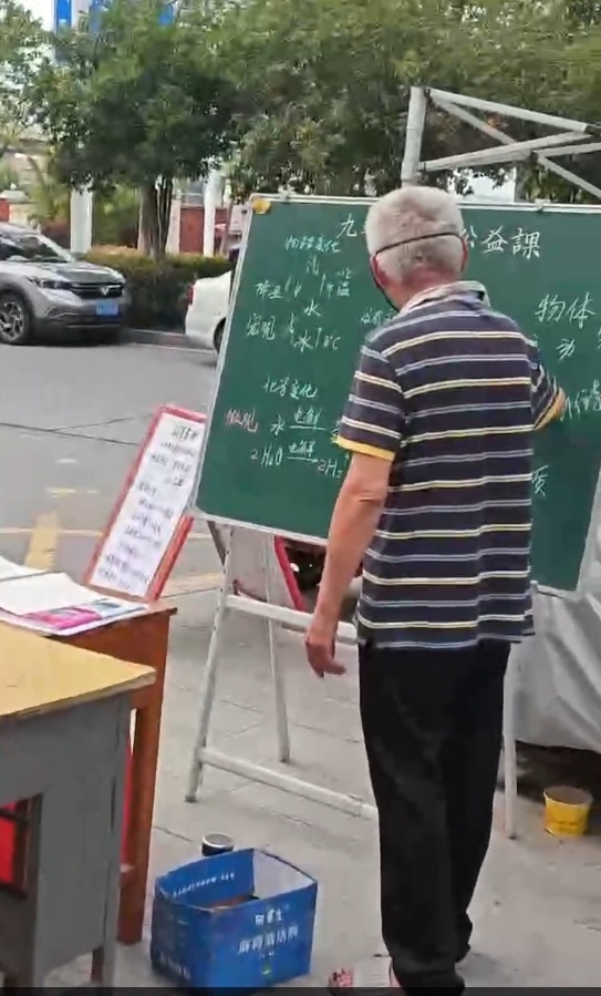 现年71岁的王师傅表示,这个露天课堂已持续开设9年,今年,他因身体原因,仅开设其擅长的书法与化学课程。“九年级新开化学课,也想借此机会帮孙子预习教材内容。”他解释道。近期,他的课堂主要面向初中生,课时约2小时。