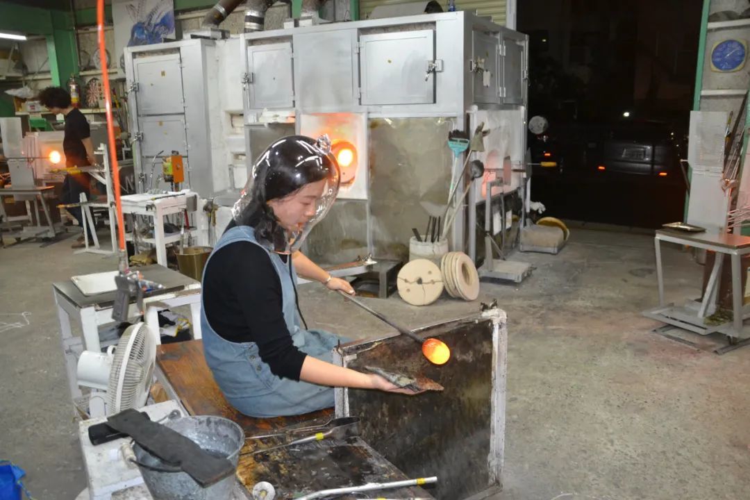覃钰玲在吹制玻璃