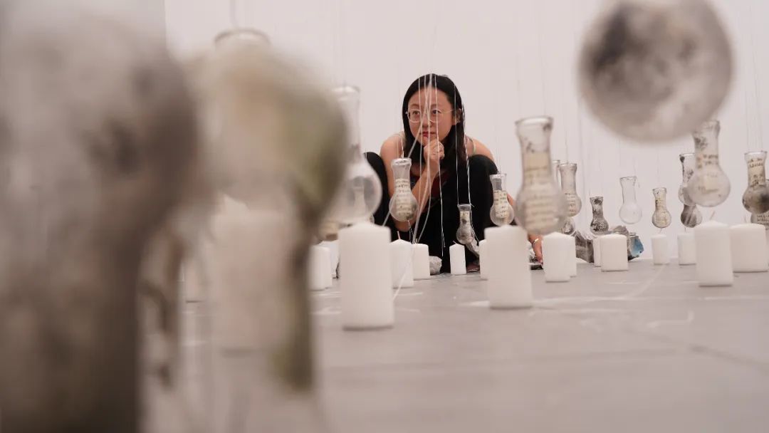 “一个个玻璃容器里,塞着写满作品想法的纸条。 玻璃容器里面,放着写满作品想法的纸条。当炙烤容器的蜡烛烧化,当金钱不再是创作的限制时,创作还会存续吗?”