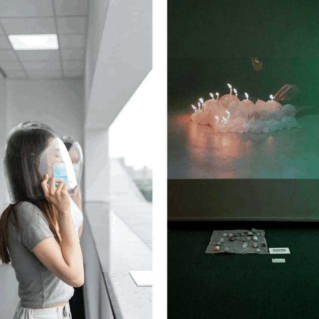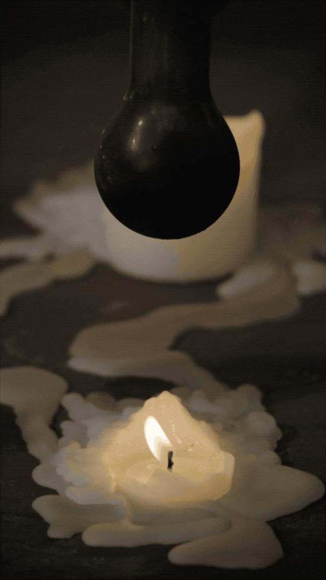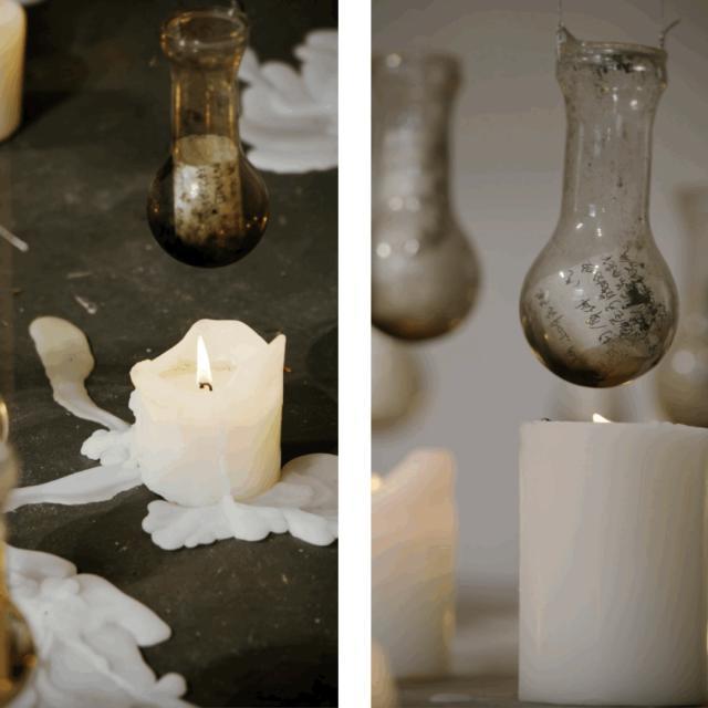 我这个装置,一个个玻璃容器里,塞着写满作品想法的纸条,底下是蜡烛,象征着现实生活的炙烤。刚把蜡烛点起来的时候,,里面的纸会被烤焦。但随着时间过去,蜡烛会慢慢烧短,火焰逐渐降低,到最后已经烤不到你了——就像在工作和生活里摸爬滚打,当生活压力不再是每天要焦虑的事时,你还能再静下心来做作品吗?