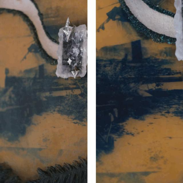 玻璃照片系列,我们小时候会有那种书桌,先垫一层纸,上面放上照片,最后再盖上一块和桌面一样大玻璃,我就把蓝晒的照片印在玻璃上面。这些老照片,工厂、废弃的剧院,我小时候六一儿童节在那拍的照片……上面没有封层,它是回忆过去的东西,它是会随着时间会变形和消逝的。
