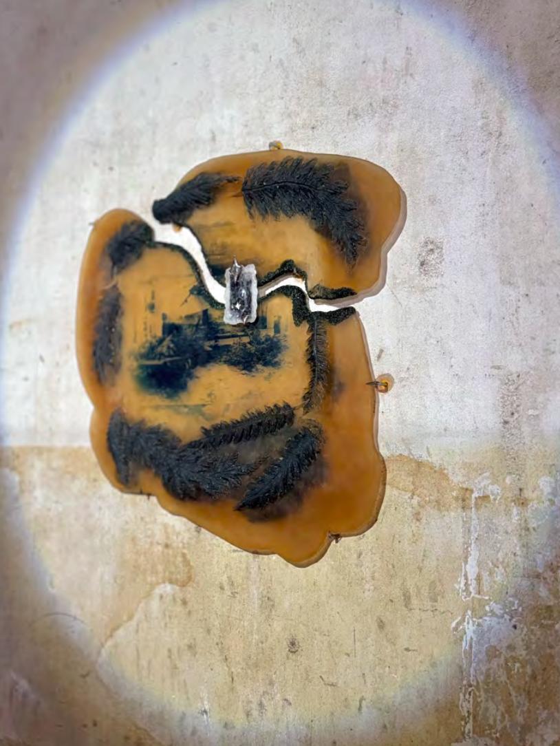 《宿舍区门口》,它的基底是用砖头跟水泥做的,然后用灯工玻璃做了很多小的苔藓,趁水泥还没有干种进去,看起来像从水里面长出来的一样。
