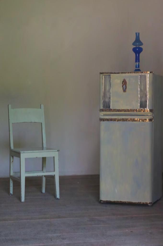 这件作品叫《蓝色花瓶》,小时候我们那都会在冰箱上面放一个蓝色、红色花瓶,里面插满了假花,我复刻了这个记忆里的场景。冰箱内部,包围住的是我跟外婆小时候的照片。