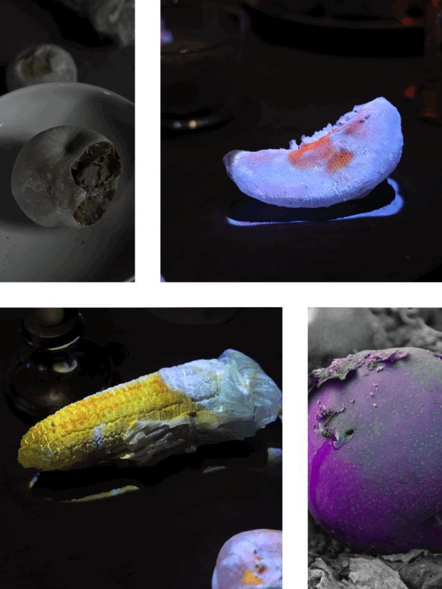 这个“封存遗体”的概念,最早是我在日本富山,面对当地成片的梨树,春夏秋冬观察梨树从发芽、结果,到被自然或人为淘汰、掉落果实的过程。我就想为它们办一场葬礼——捡了很多地上掉落的梨子翻模,把梨灰烧在玻璃罐里。